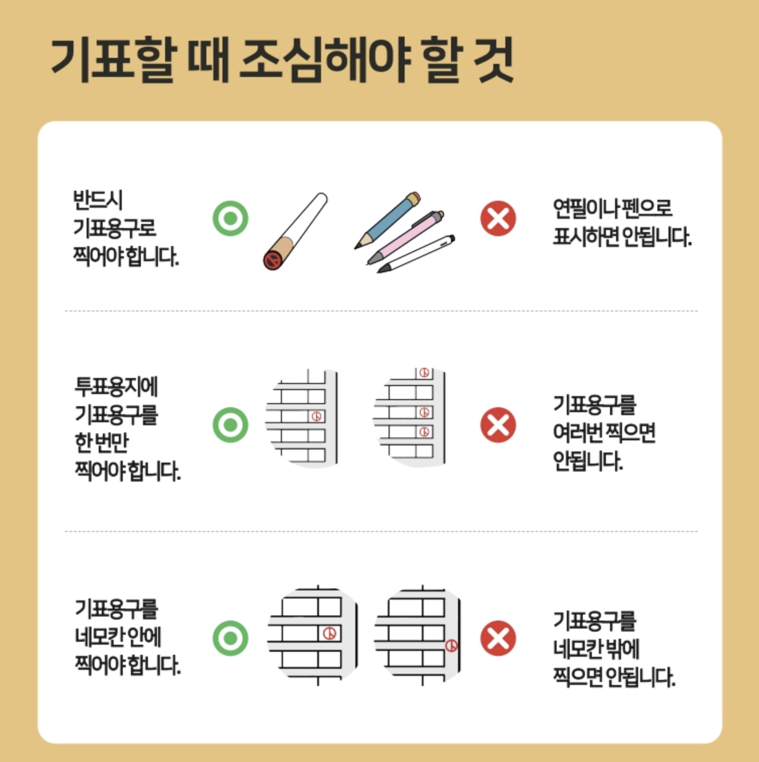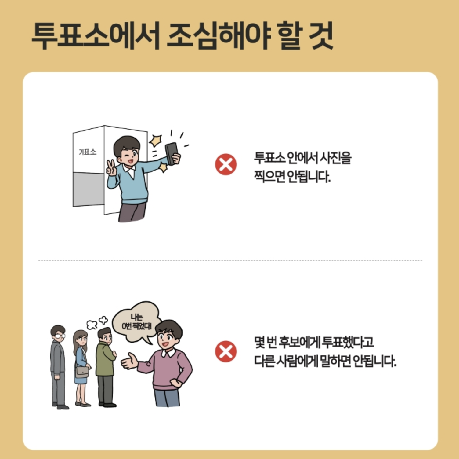 투표소와 투표장에서 주의할 점을 숙지하여 큰 문제 없이 국민의 권리를 다하는 날이 되면 좋을것 같죠?