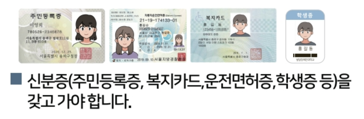 본인임을 증명 할 수 있는 신분증 (주민등록증, 복지카드, 운전면허증, 학생증 등)을 꼭 갖고 가야 합니다!