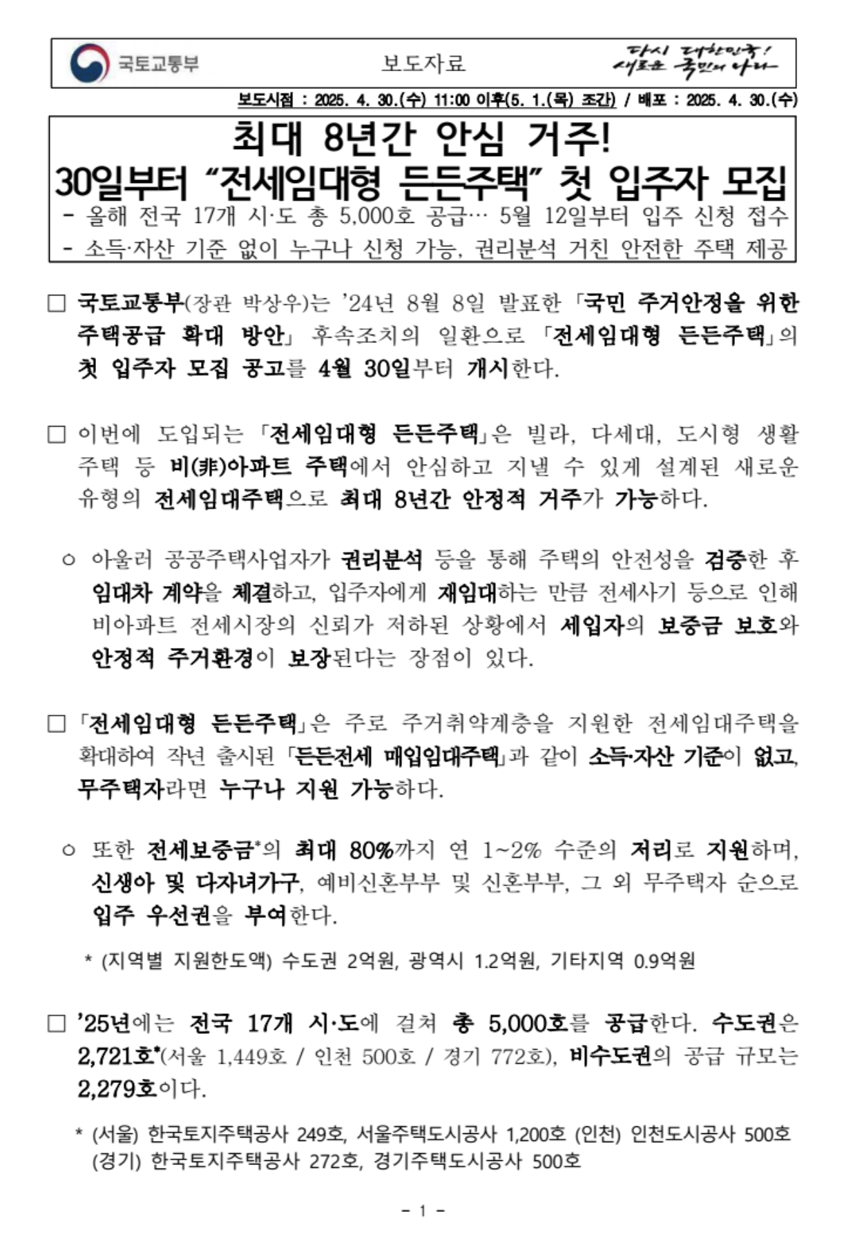 2025년 5월, 주거 불안정을 해소하고 모든 무주택 가구에게 안정적인 보금자리를 제공하고자 국토교통부와 LH(한국토지주택공사)를 비롯한 주요 공공주택 사업자들이 혁신적인 공공임대주택 모델인 '전세임대형 든든주택'의 입주자를 대규모로 모집합니다. 오늘은 입주자가 되실 여러분들을 위해 관련된 정보를 보기 편하게 정리해보겠습니다.